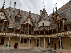Az épületegyüttes ámulatba ejtő. Ahogy az ember belép a főkapun (némi sorban állás után) az első pillanatban elakad a lélegzete: hatalmas, pompás palota, oszlopos árkádokkal, karcsú tornyokkal, manzárdablakok sorával, a csodás festett tetőcserepekkel (tuiles vernissées). Nem hiszed el, hogy kórház volt, kórháznak épült, méghozzá a szegények kórházának. Nagy bűnei lehettek Monsieur Rolin-nak, azt biztos…