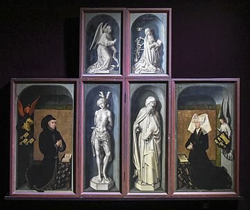 A poliptichon összezárva látható tablói. A balszélen Nicolas Rolin, a jobbszélen a felesége látható. (Wikipédia)