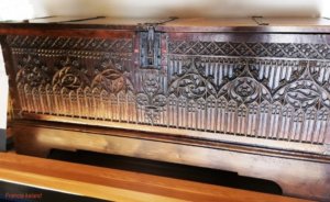 A gyönyörűen faragott, diófából készült ládán az összekapcsolódó boltívekkel körbefogott rozetták sorozatait egy